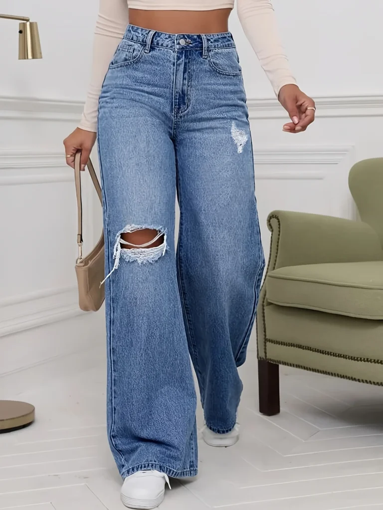 Women’s non-stretch denim trousers, straight loose wide legs, ripped design, comfortable fabric, suitable for wearing outside.