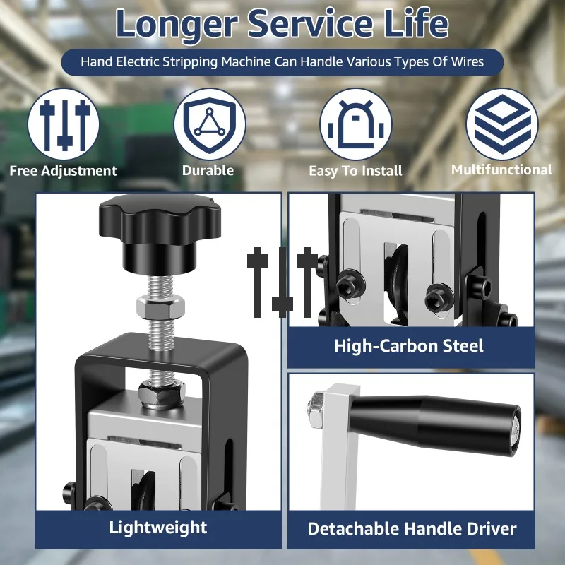This wire stripping machine features a detachable hand crank for smooth, convenient operation. It can also be connected to an electric drill for automated stripping, significantly boosting efficiency.