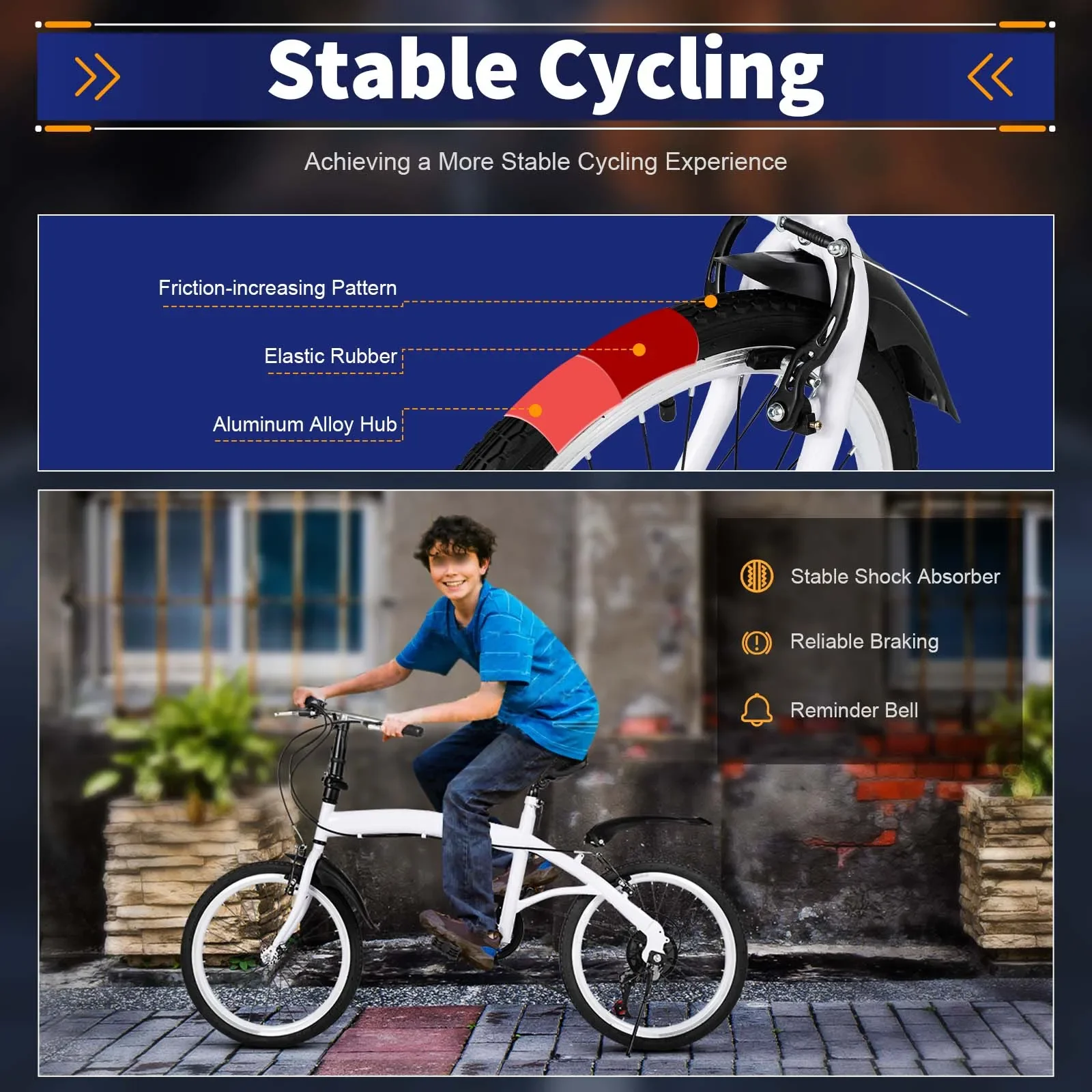 20 Inch 6-Speed Folding Bike for Adults & Teens | Portable Kids Bicycle Load 90kg | Height Adjustable Riding Mountain Bike White