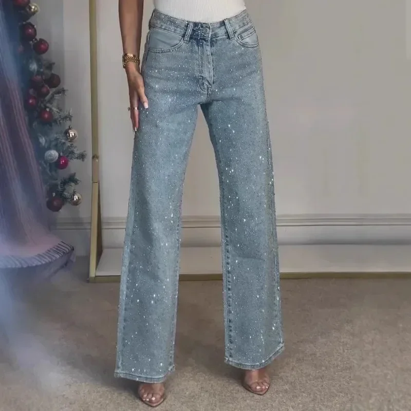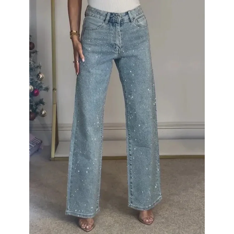 2025 Women Jeans Straight Diamonds Pants Stretch High Waist Washed Mom Jeans Y2k Streetwear Trousers Vintage Denims Streetwear