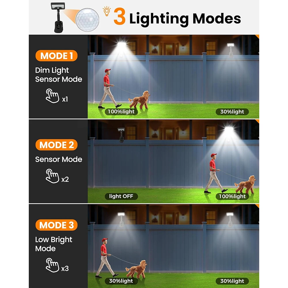 3 Smart Modes for All Scenarios: Dim-Bright-Dim / Motion-Activated / Steady Low Light. Detects humans & animals reliably.The solar motion lights outdoor waterproof easily detects movement from people or animals, ensuring reliable performance.