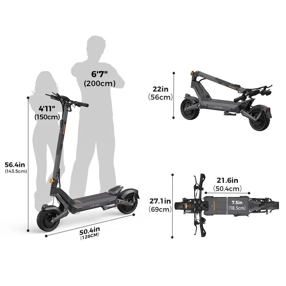 The L2 Max off-road e-scooter is equipped with two robust motors that deliver up to 2688W power with a top speed of 40 mph (65 km/h) and a maximum climb angle of 46%, letting you speed up in a flash and climb steep hills with ease. Its high-capacity 20.8Ah battery enables a long-lasting cruising range of up to 56 miles (90 km). Thanks to dual charging inputs, you won't have to wait long to fully charge the battery by using two chargers simultaneously. Embark on exhilarating, long-distance journeys in a snap.