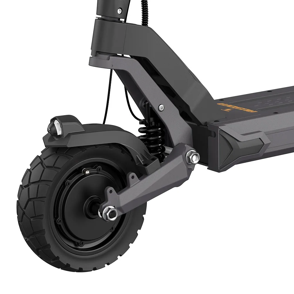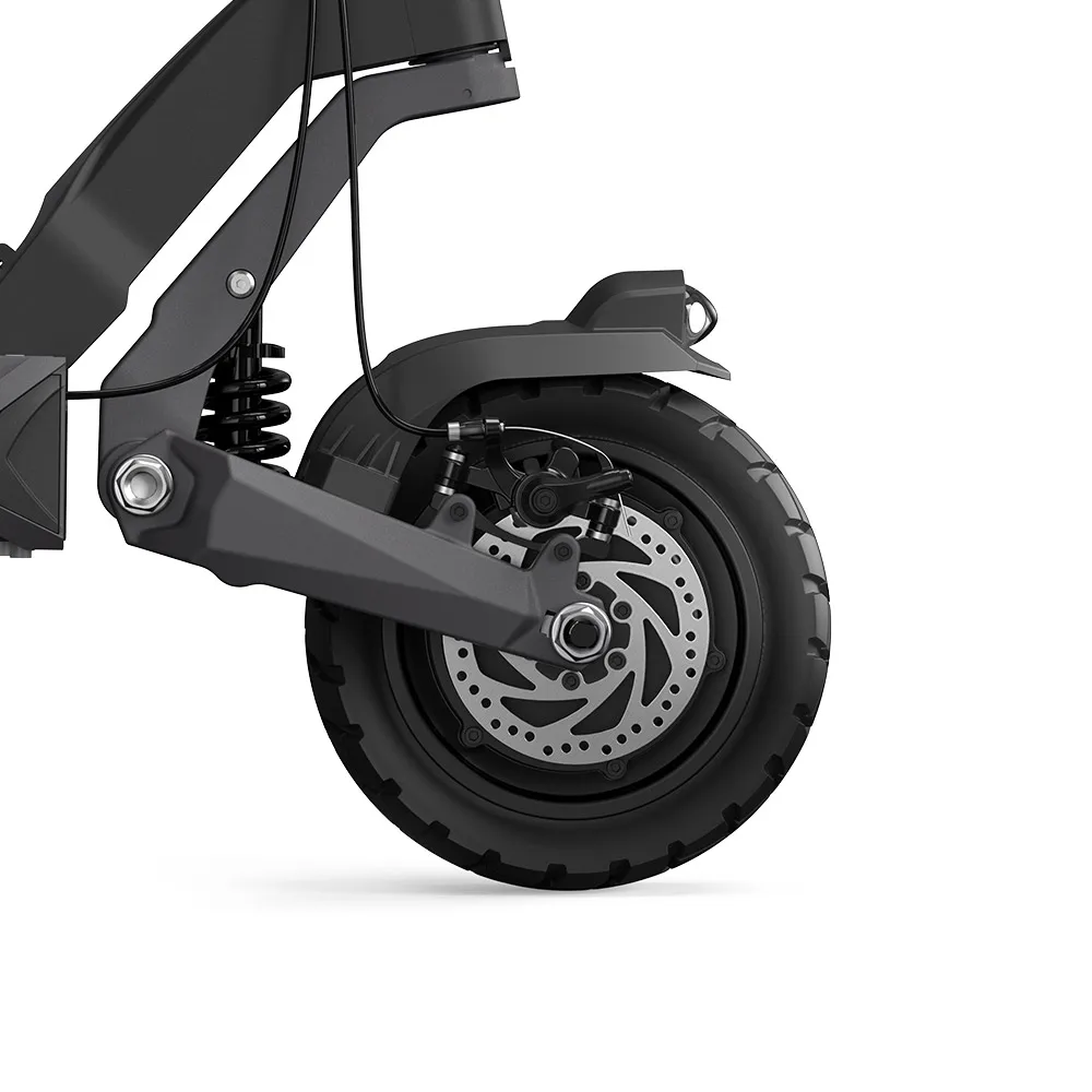 The Ausom L2 Max Dual Motor features dual rugged swingarm suspension using the aircraft landing gear system, which provides the best shock absorption for a smooth SUV-like ride over bumpy and challenging roads. Built tough with forged aluminum alloy, this off-road electric scooter is highly resistant to breakage with a load capacity of up to 287 lbs (130 kg), which is ready for heart-pounding adventures. Its 10"x3" tubeless knobby tires are thickened and ruggedly processed with high wear and puncture resistance for a more stable and smoother glide over diverse terrains.