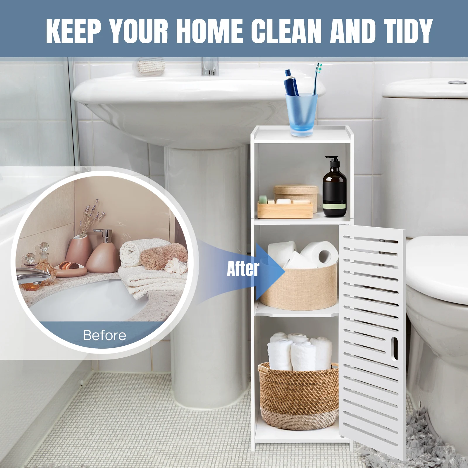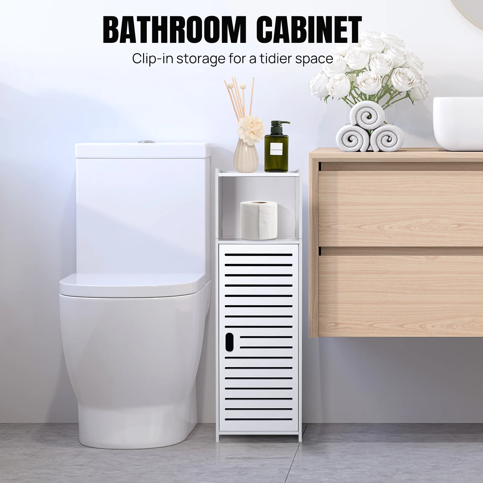 With this slim storage cabinet makes your home bathroom or living room more comfortable and tidy. With the white color, It is perfect for any house style, like bedroom, living room, bathroom, hallway, study or office, and also easy matching with any type of furniture.