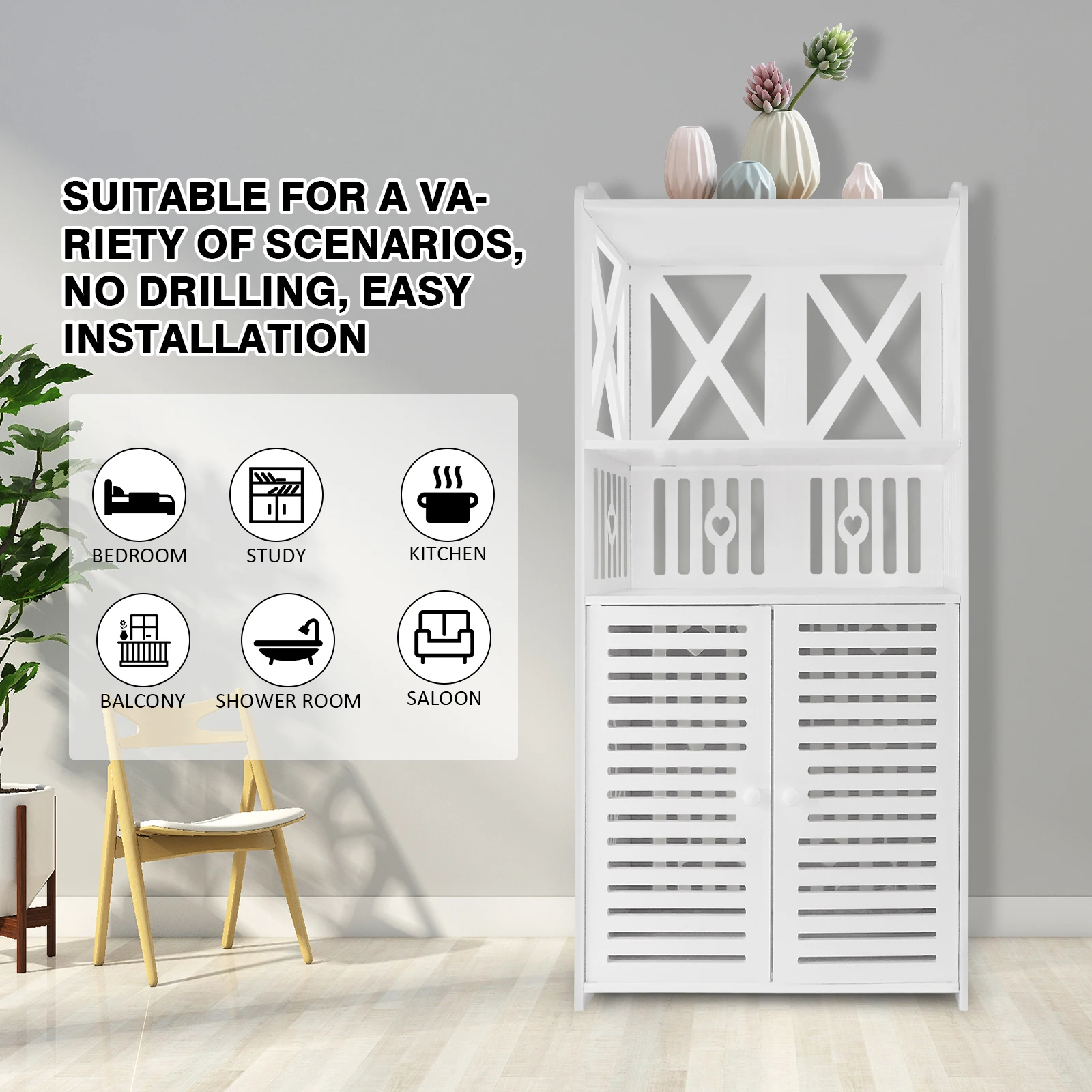 This locker is not only the perfect storage solution for bathrooms, but also can be used for kitchens,living rooms, bedrooms,hallway, offices, etc,like put books in the bedroom,decorations in the living room,and potted plants on the balcony…