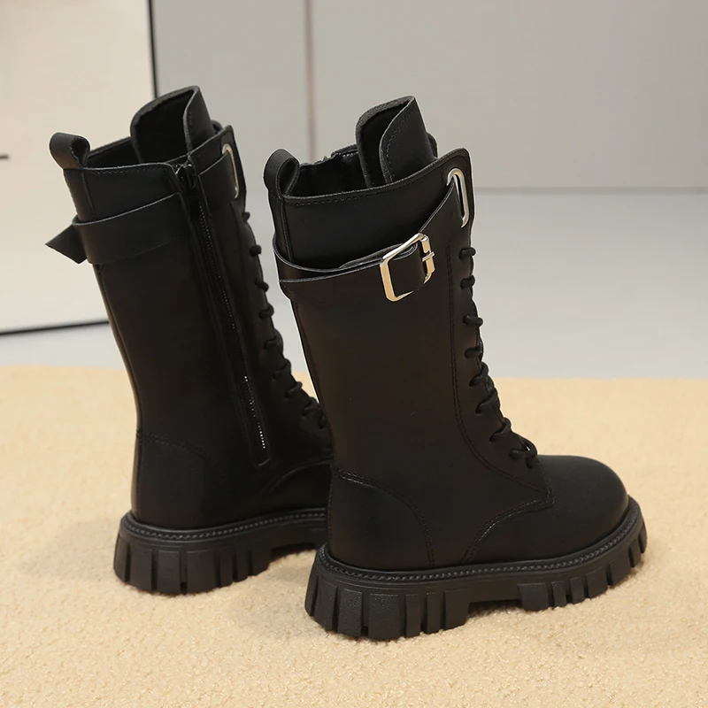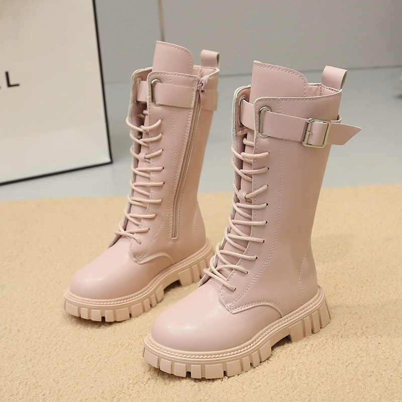 Children’s Knee Fashion High Combat Boots Pink/White/Black Buckle Strap Side Zipper Thick Sole Girls Winter Warm Boot Size27-37