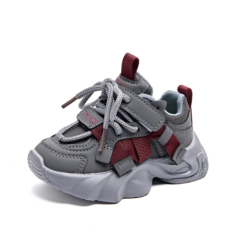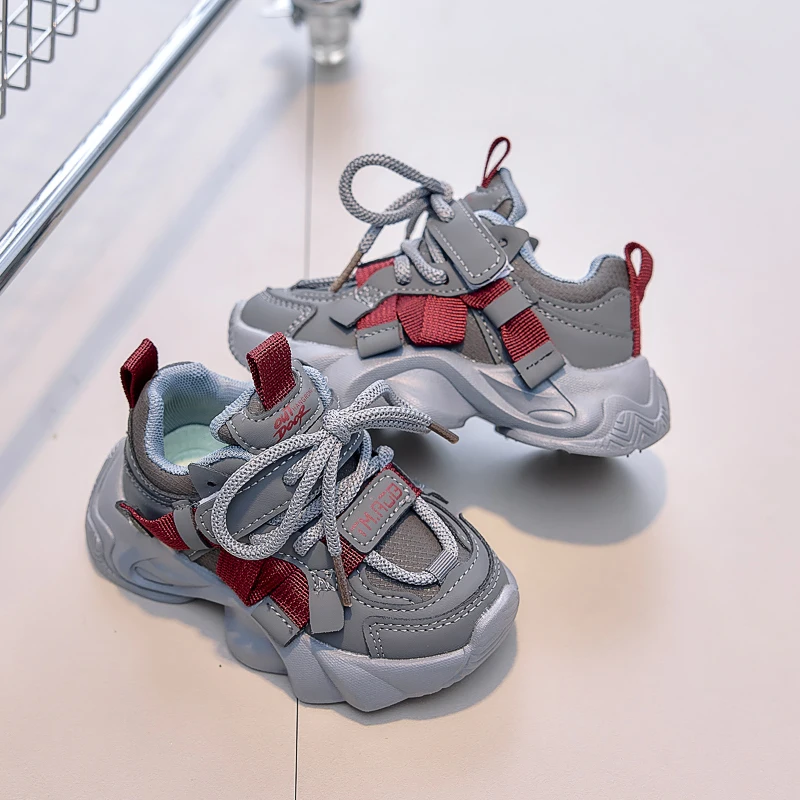 Comfy Kids Boys and Girls Gray and Red Color-Blocked Mesh Dad Shoes, Breathable Soft-Soled Velcro Wear-Resistant Grip-Enhancing Lightweight Children’s Sports Shoes, Suitable for Spring and Autumn, for Older Children, Students, Daily School Wear, Outings, Running, Versatile Casual Shoes
