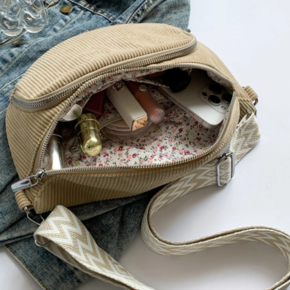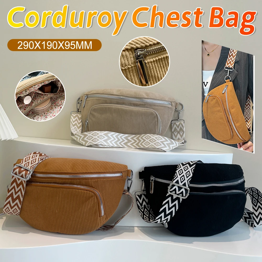 Corduroy Chest Bag Stylish Crossbody Sling Bag Wide Guitar Strap Multi-pocket Waist Bag for Women Outdoor Travel Casual Hobo Bag