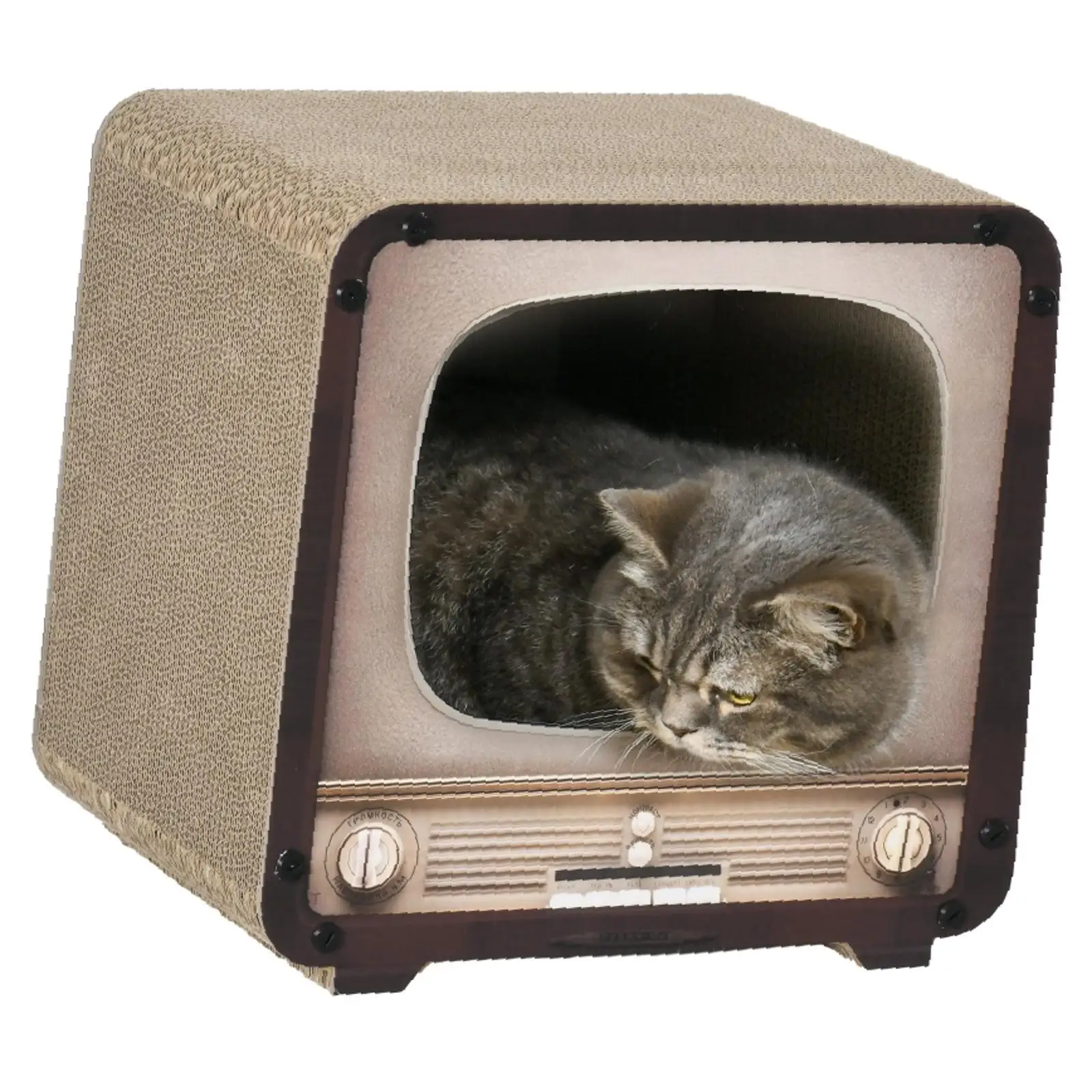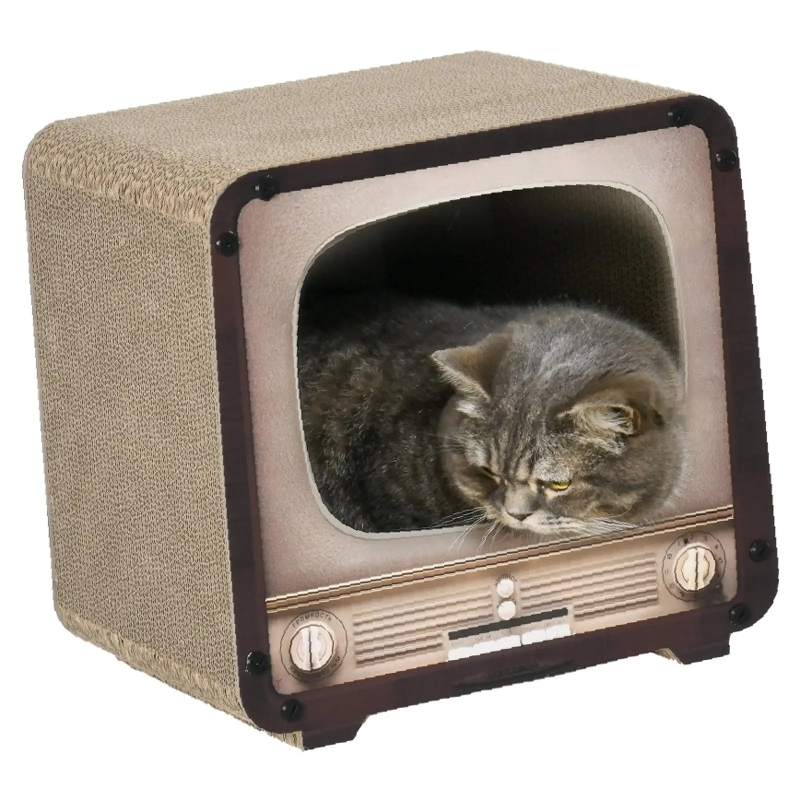 Vintage TV design: This cat scratcher features a charming vintage TV shape with a cat hole as a screen and 4 TV buttons, watching your furry act a cute and funny real show!