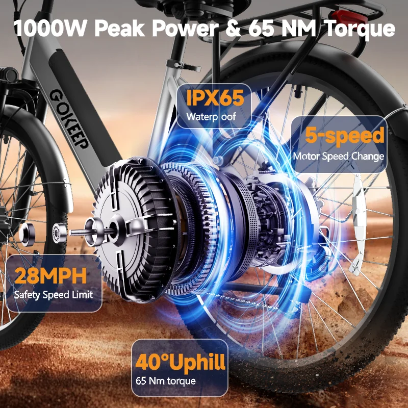 1. E26 Electric Bike with 500W powerful powerful hub-motor with 50Nm torque, which can provide 35km/h max speed.