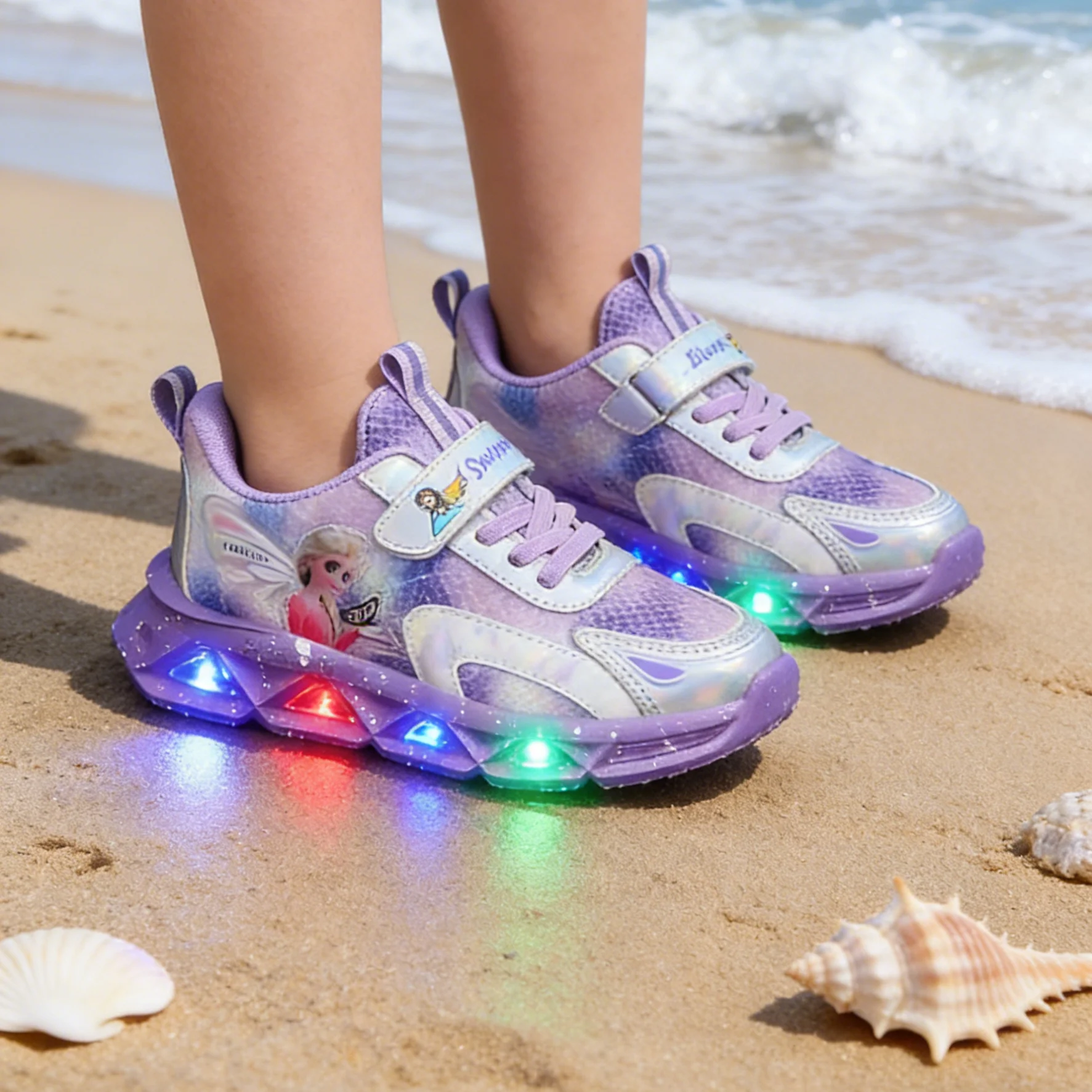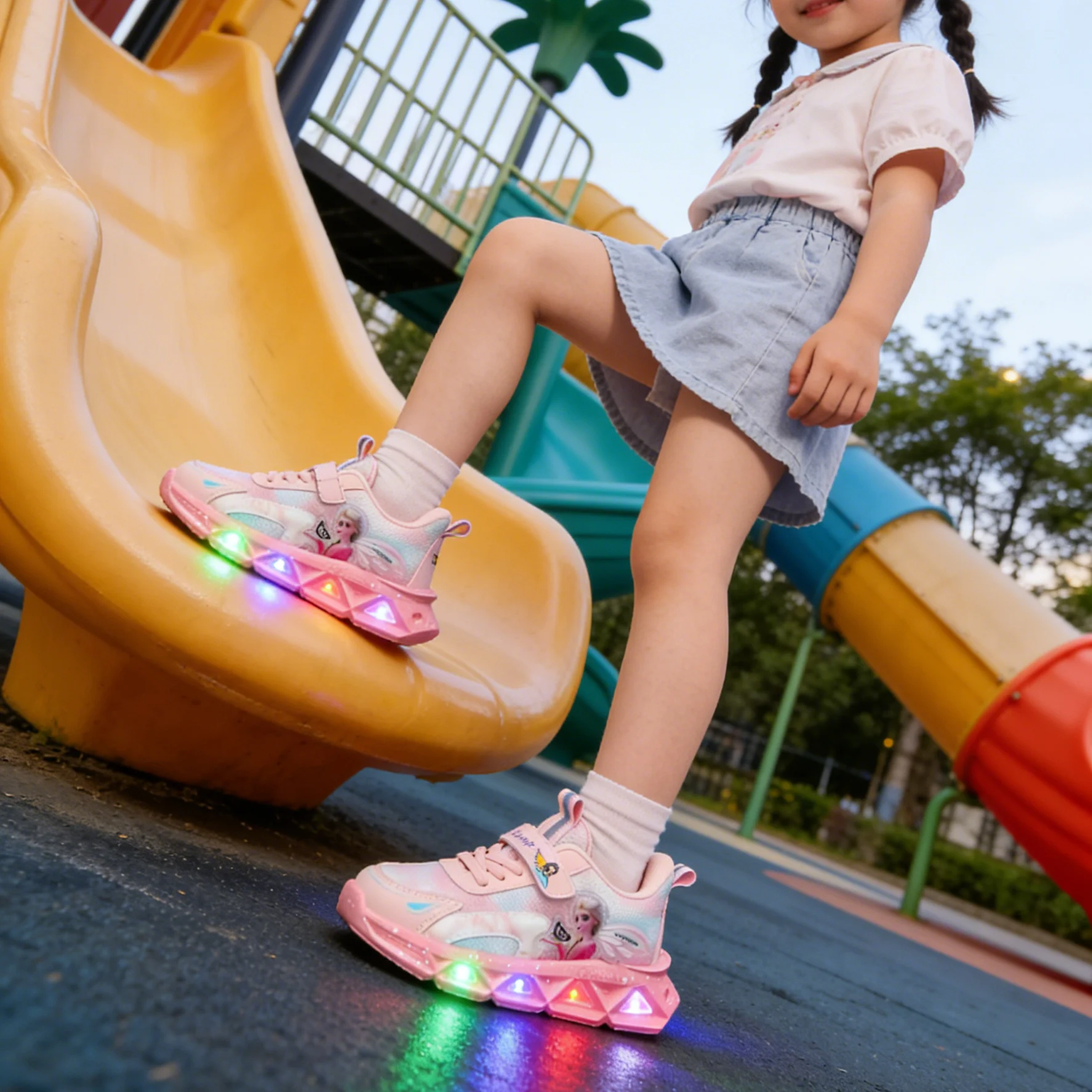 Disney Girls’ Shoes Autumn LED Light Frozen PU Leather Girls’ Sports Purple Pink Princess Elsa Shoes 22-36