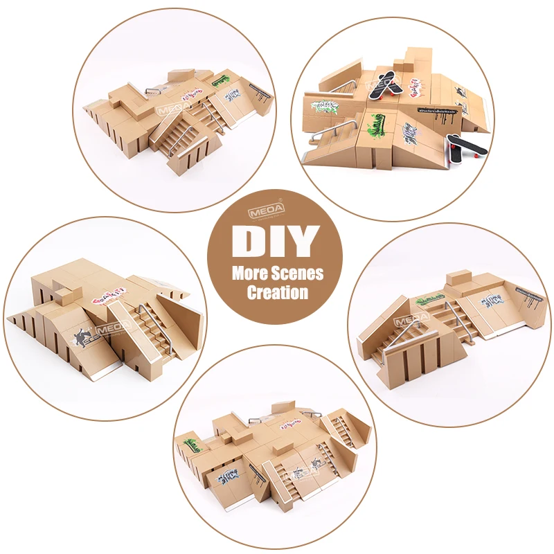 Our skate park set contains ramp, stair, handrail and more. You can creat mutiple combination with imagination and get your unique design your mini skateboards park for fingers.