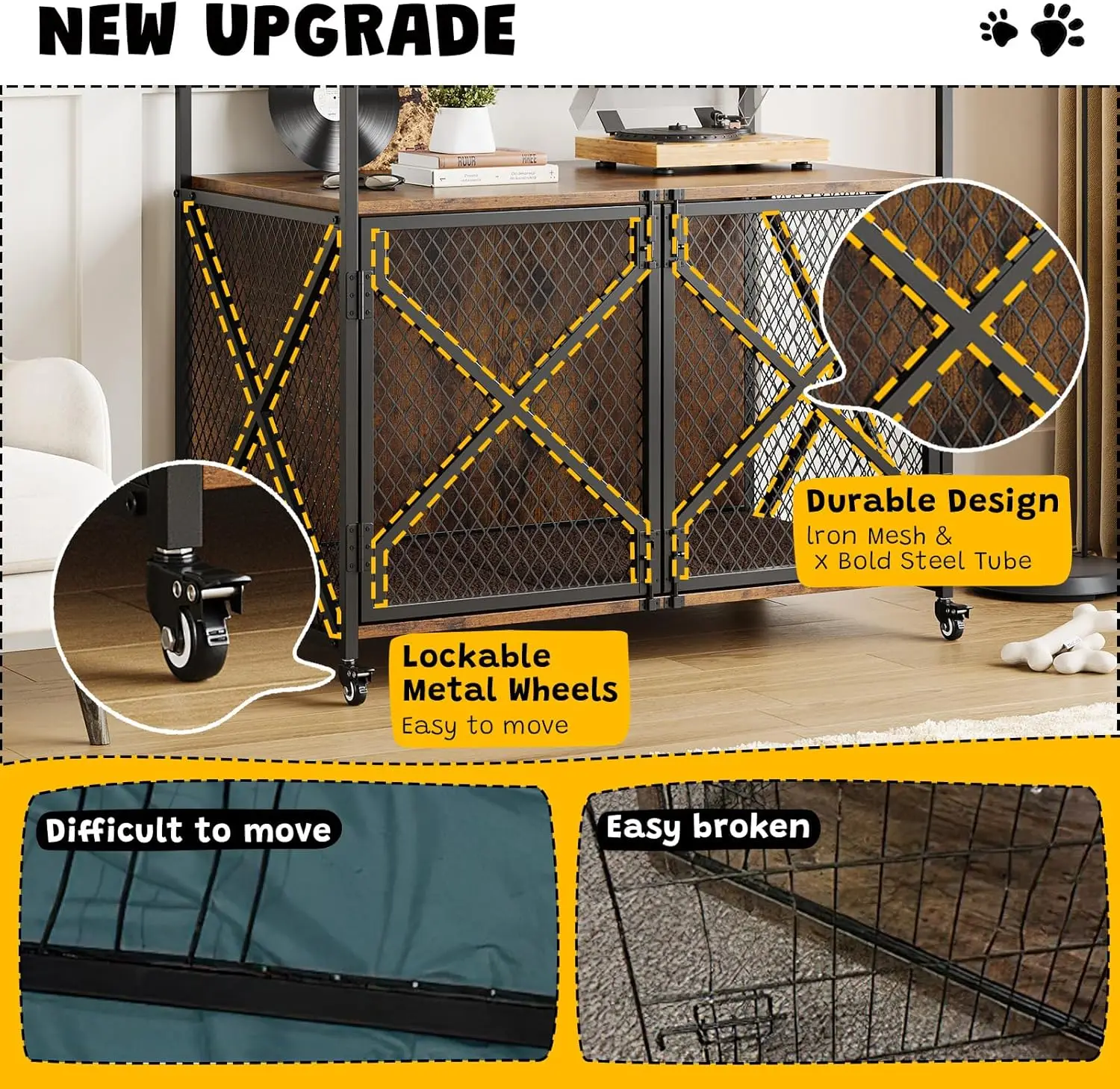 Durable Metal Frame & Safe Structure:Built with a strong metal mesh frame and thick engineered wood panels, this crate ensures long-lasting durability and excellent ventilation. Its chew-resistant design keeps your dog safe and comfortable.
