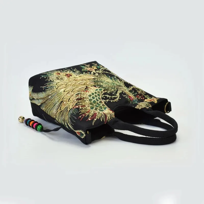Ethnic Style Sequins Tote Bag, Peacock Embroidery Handbags, Vintage Canvas Crossbody Bag