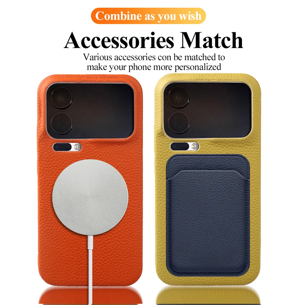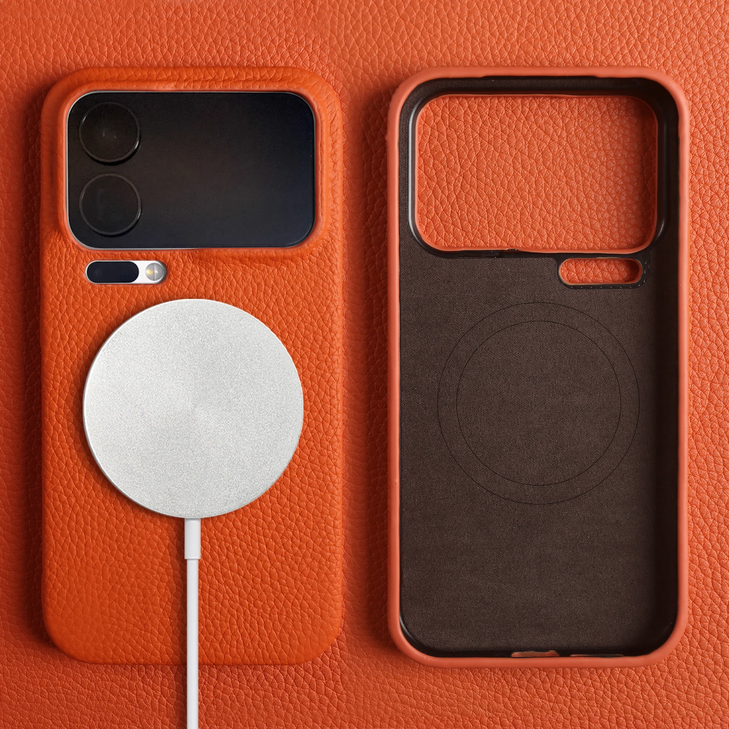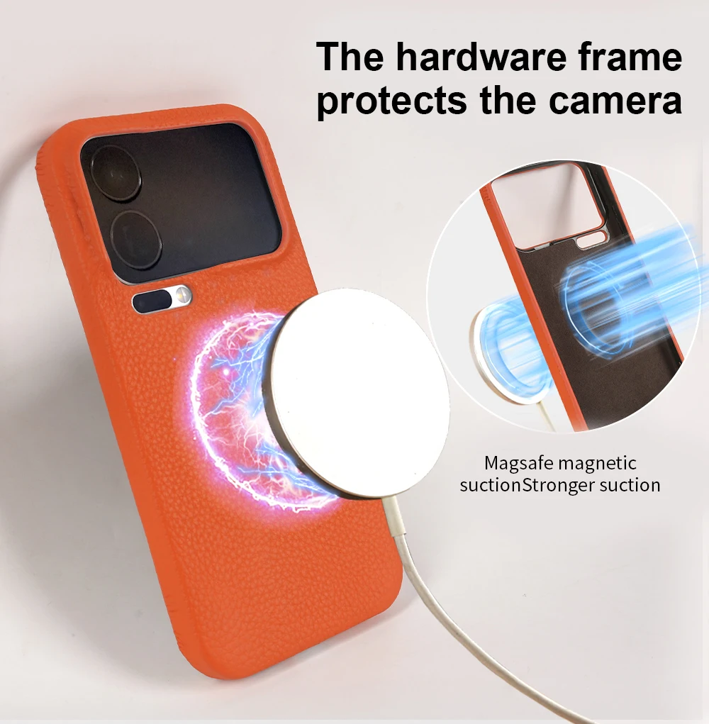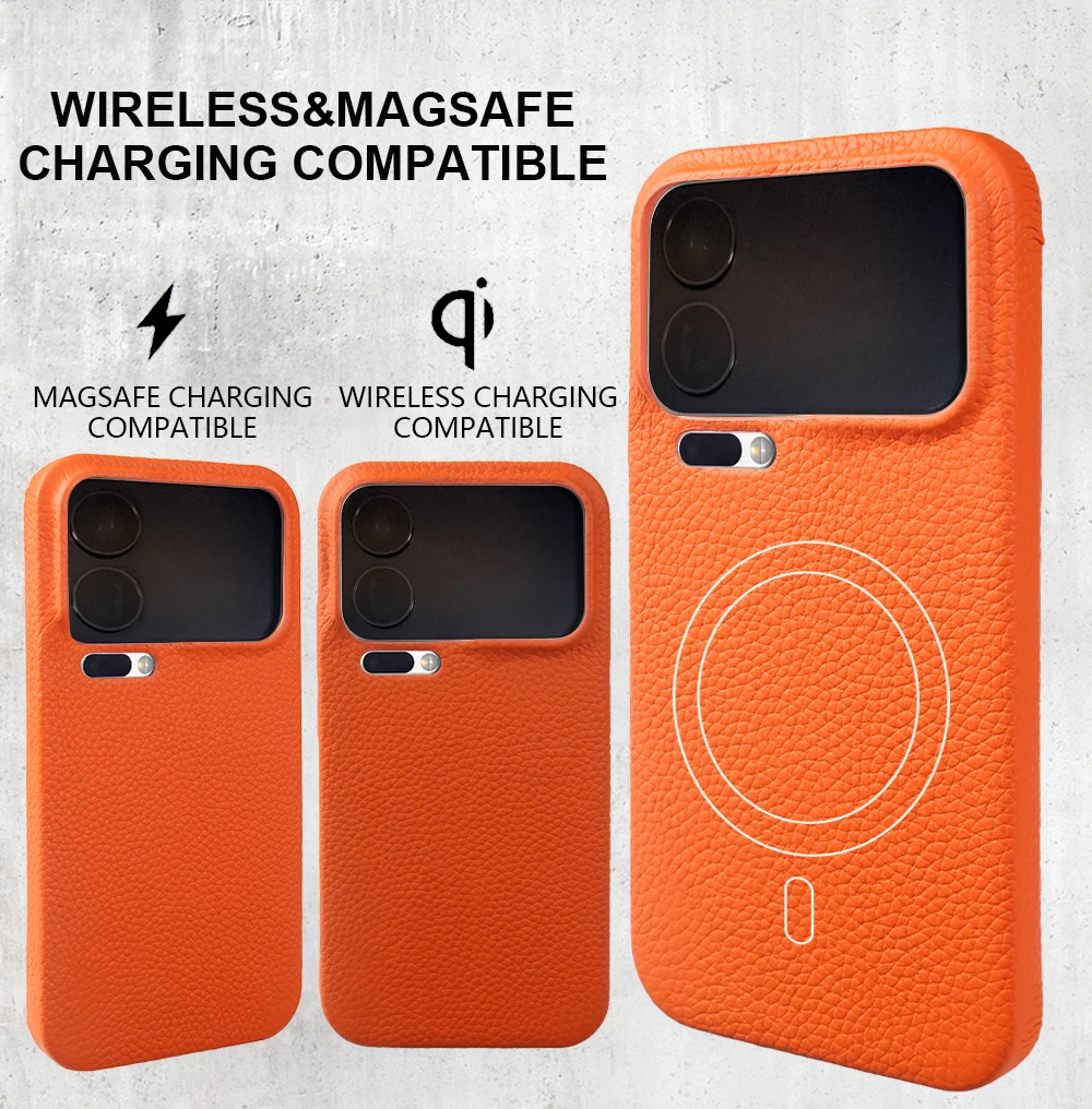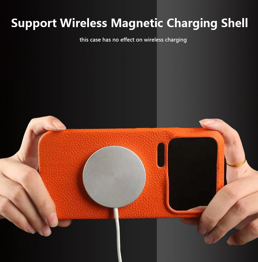 This leather from genuine leather is rich in oil, so with use, the color of the place where the phone case contacts the hand and the magnetic charger will deepen,or become shallow. Although it supports magnetic wireless charging, using the magnetic wireless charger will form a circles, so we don't recommend using magnetic wireless chargers.