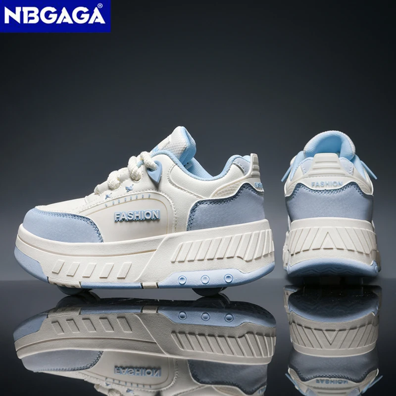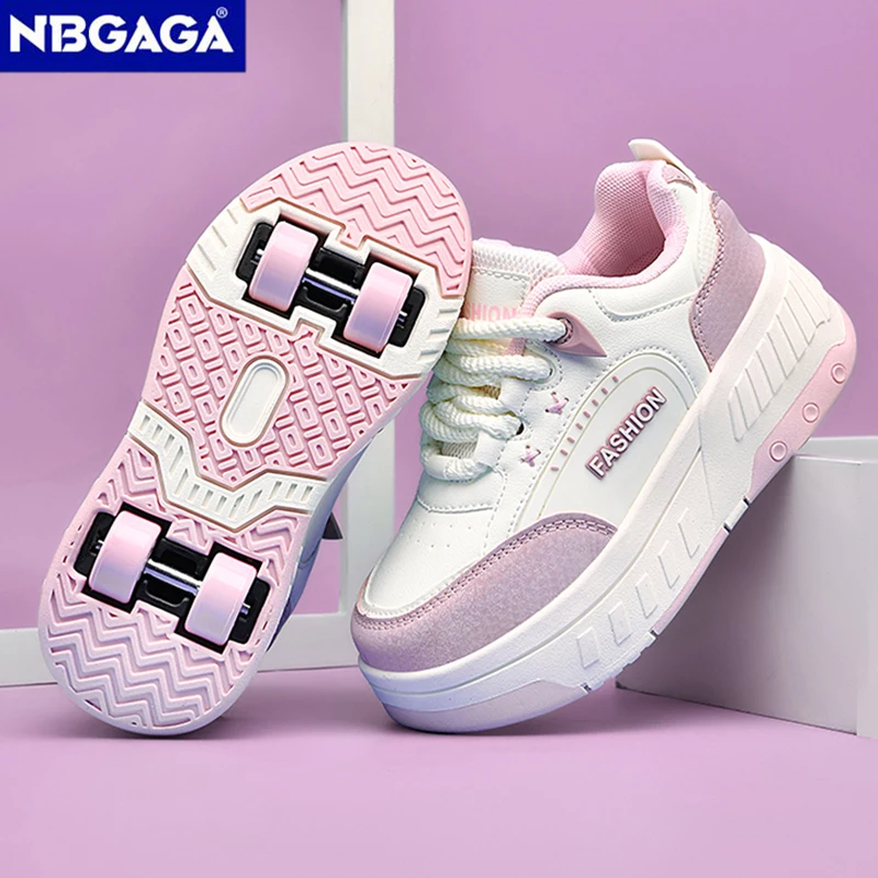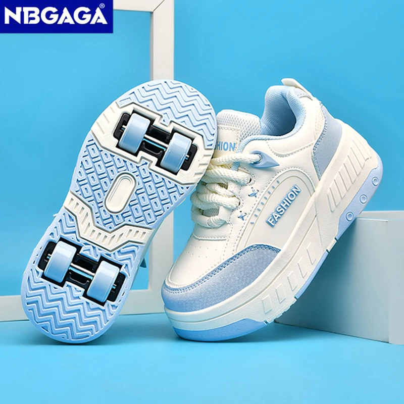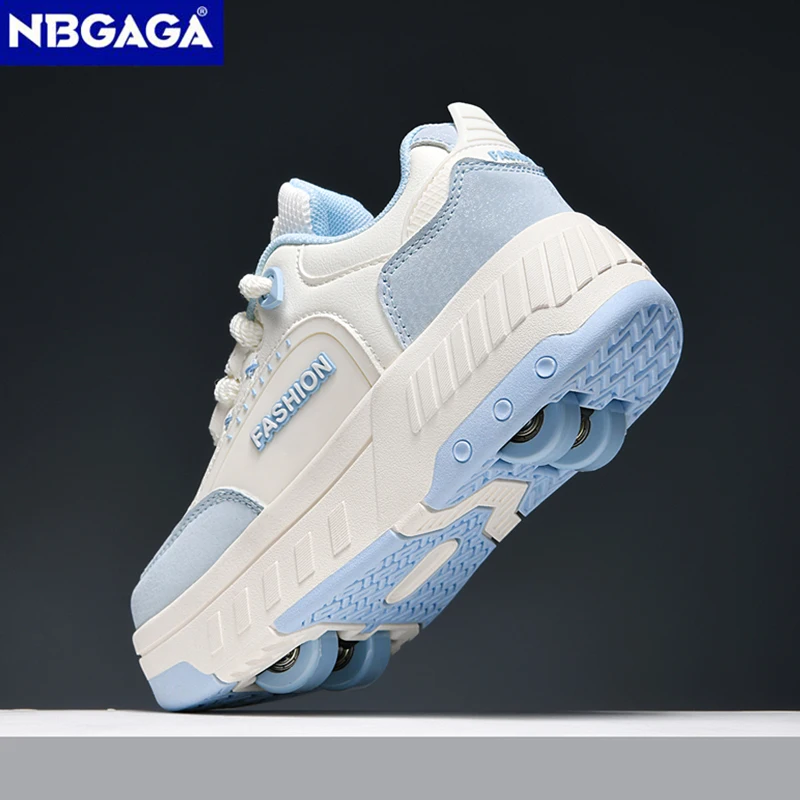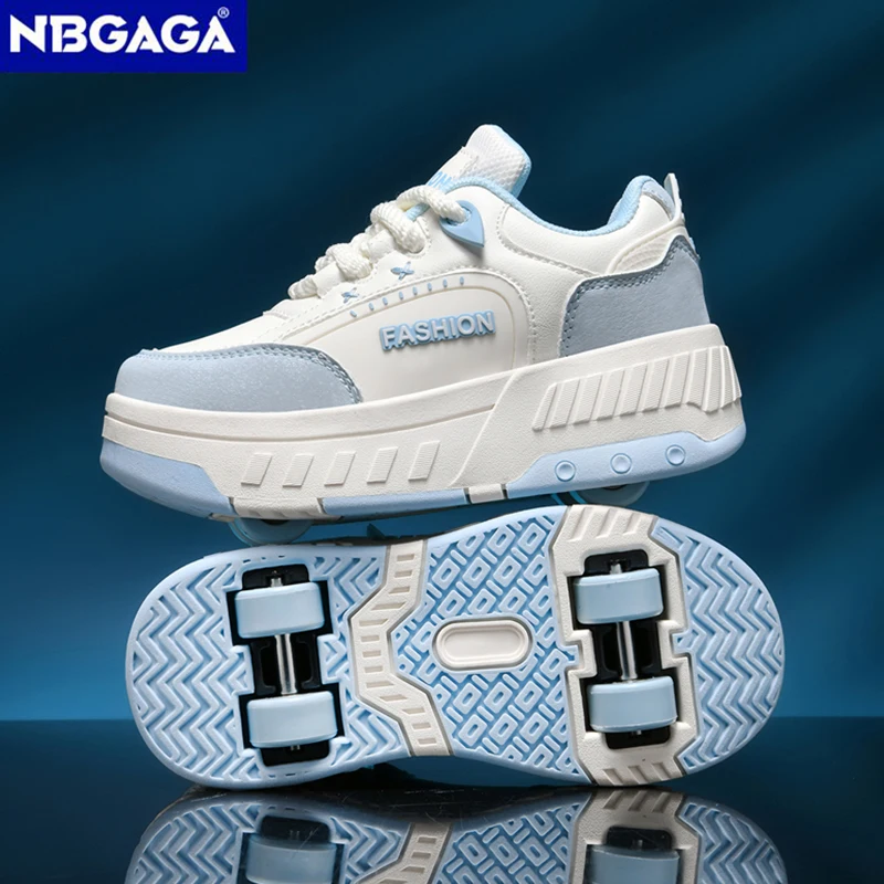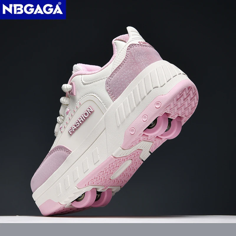 Lace-up Outdoor Breathable Walking Shoes For Children Boys Girls Fashion Four-wheeled Retractable Sports Roller Skates Sneakers