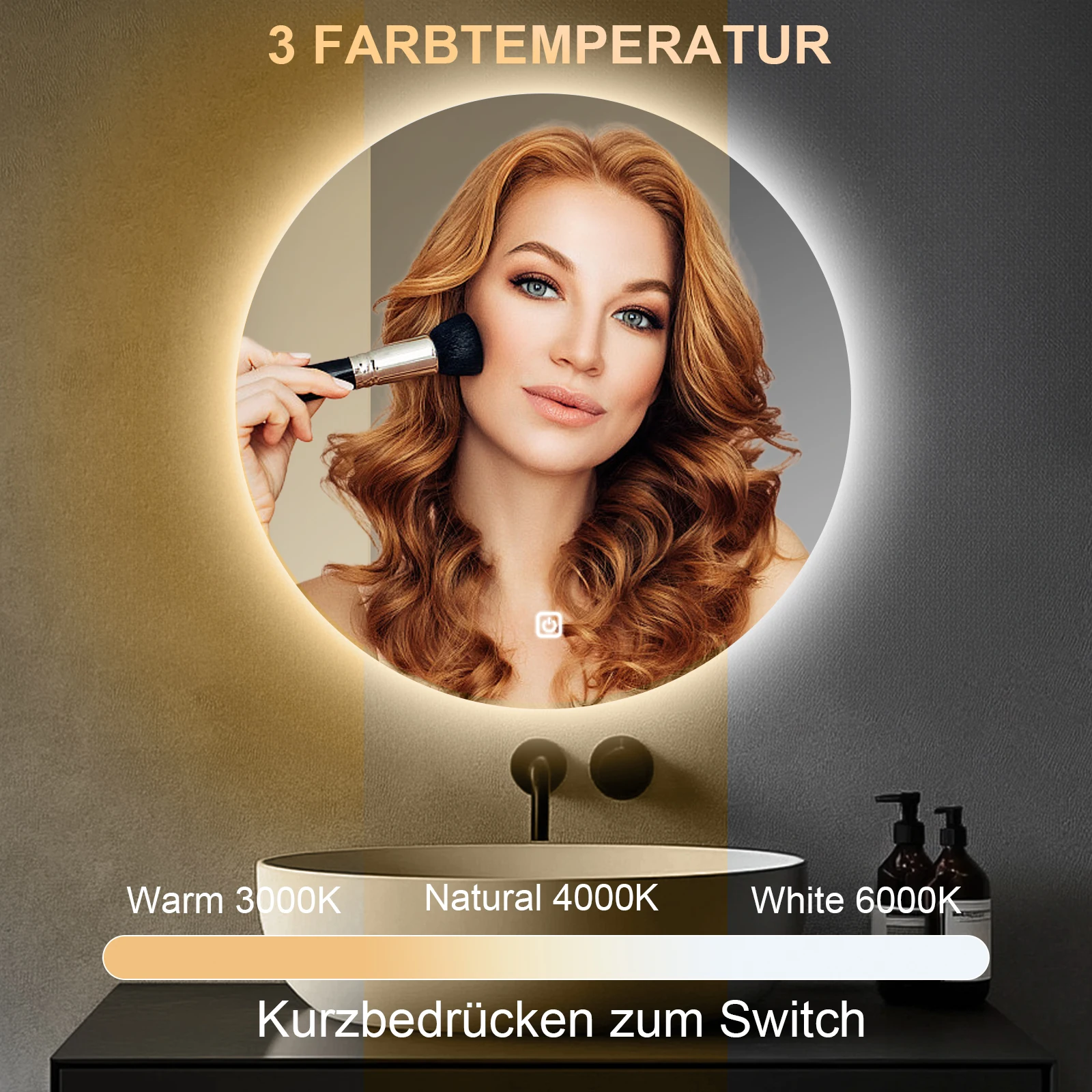 LED Bathroom Mirror Round Vanity Mirror With Backlit Lights Wall Mounted Dimmable 3 Color Lighting IP54