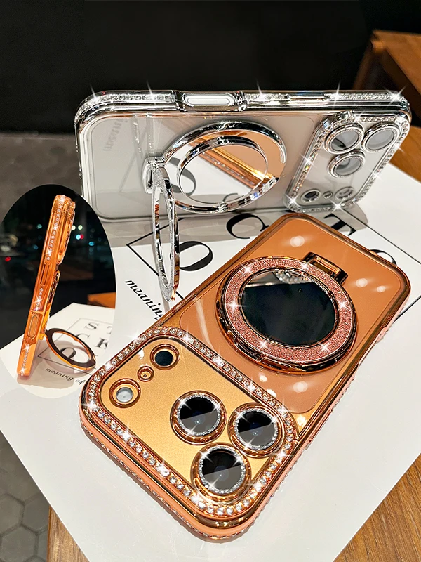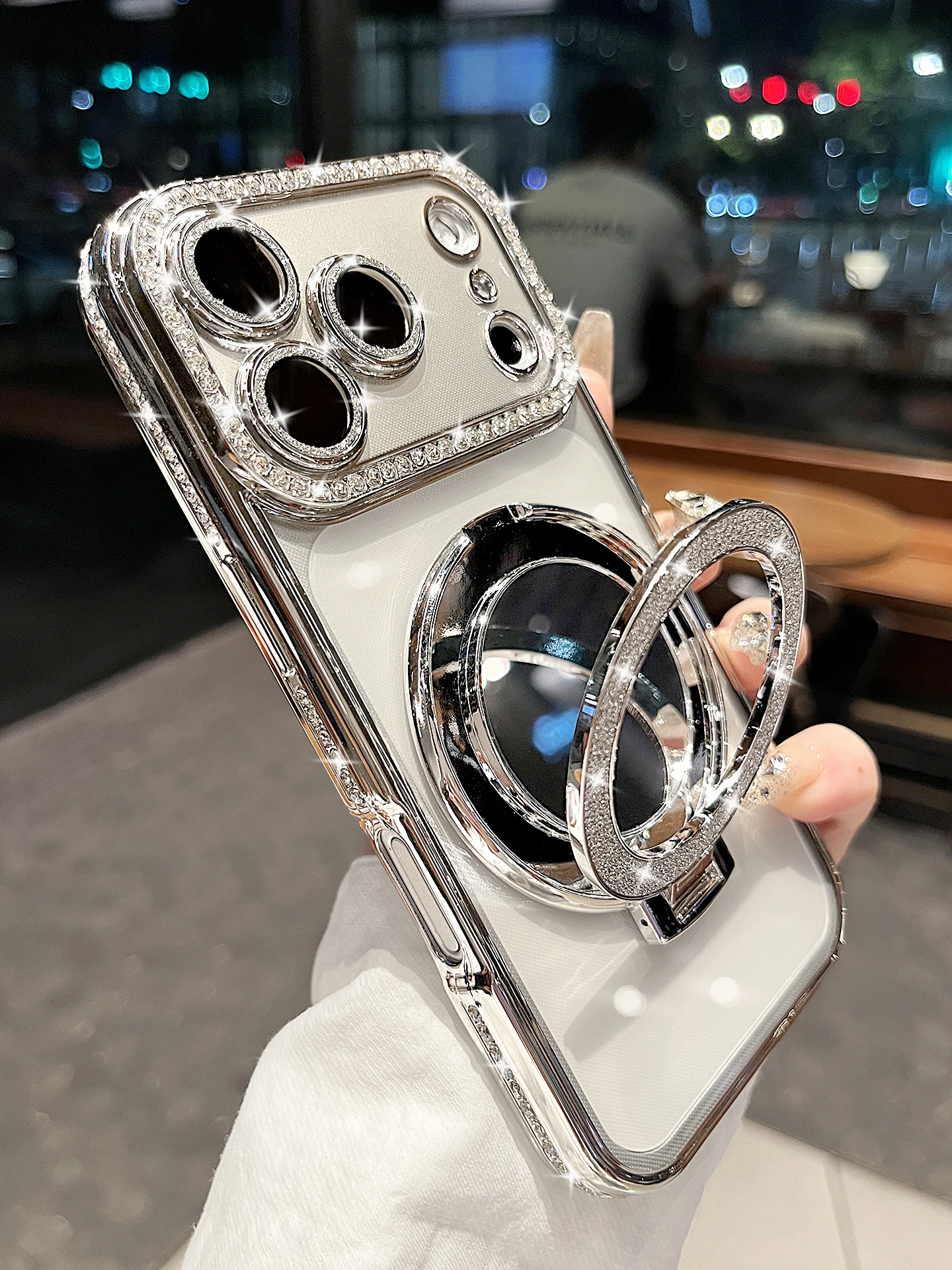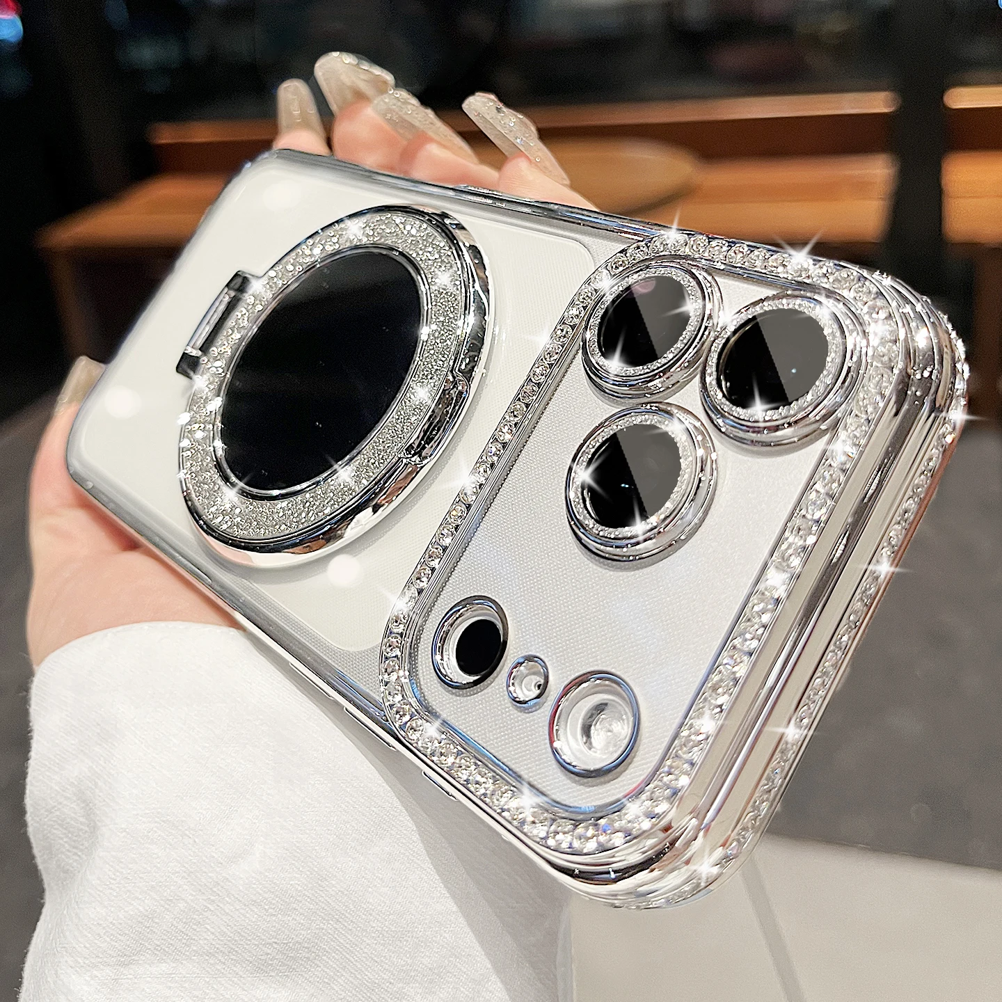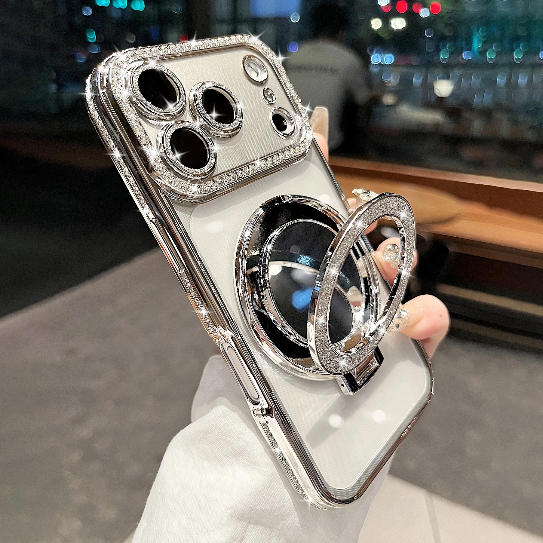 Luxury Diamond Clear Glitter For Magsafe Phone Case For iPhone 17 16 15 14 13 12 11 Pro Max Mirror Magnetic Holder Stand Cover