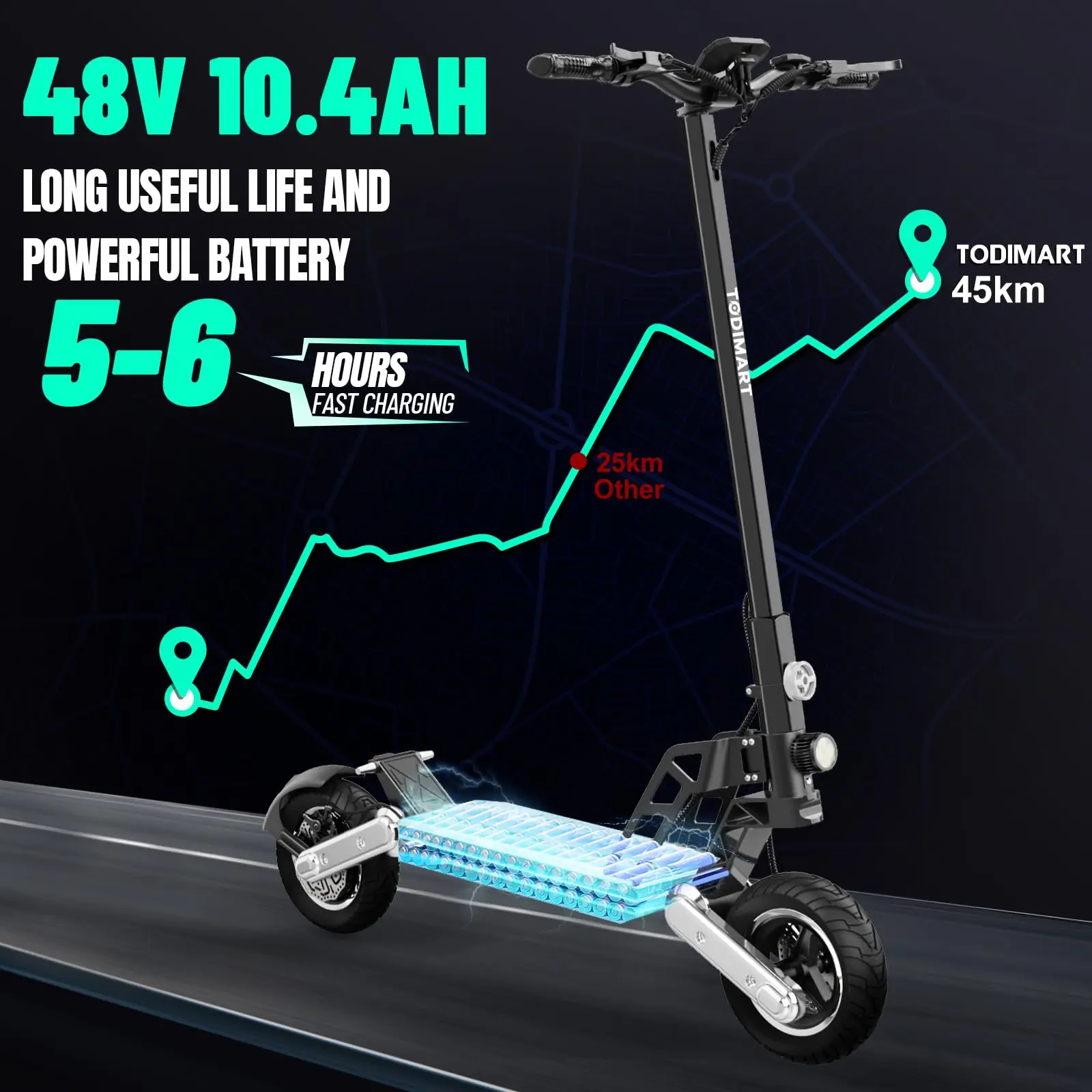 【40km Range & 48V 10.4Ah High-Performance Battery】The TODIMART G2 electric scooter features a 48V 10.4Ah high-performance lithium battery, offering an impressive range of 40-45km on a single charge. 3 speed modes – 10/15/25km/h. In addition, the scooter is equipped with cruise control.