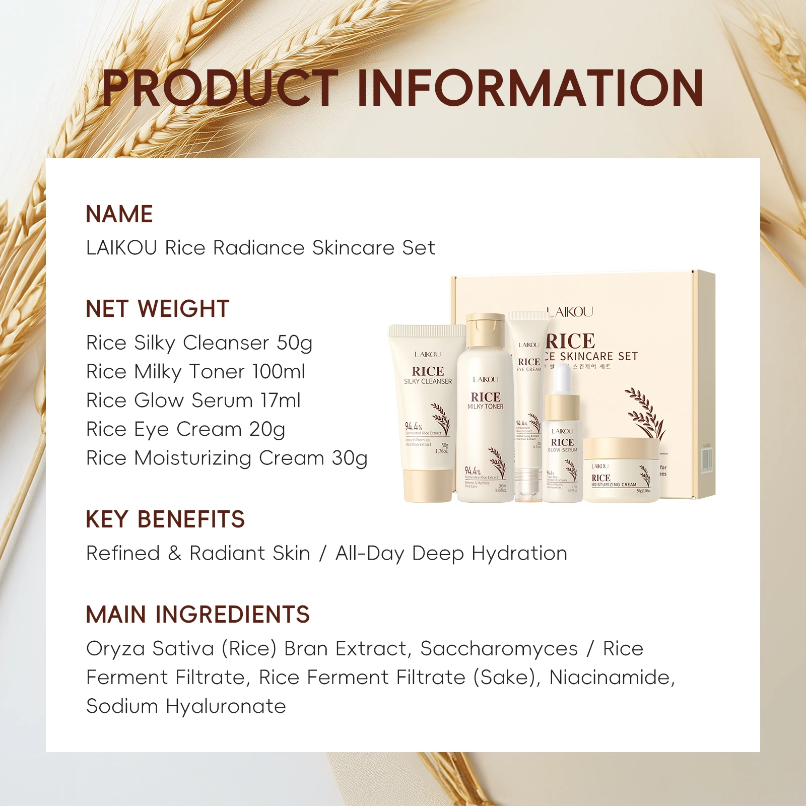 Moisturizing & Anti-Oxidation! LAIKOU Rice 5-Piece Skincare Set (50g Cleanser+100ml Toner+17ml Serum+20g Eye Cream+30g Cream)