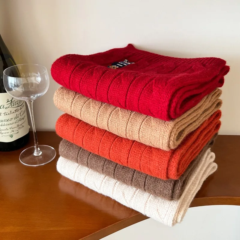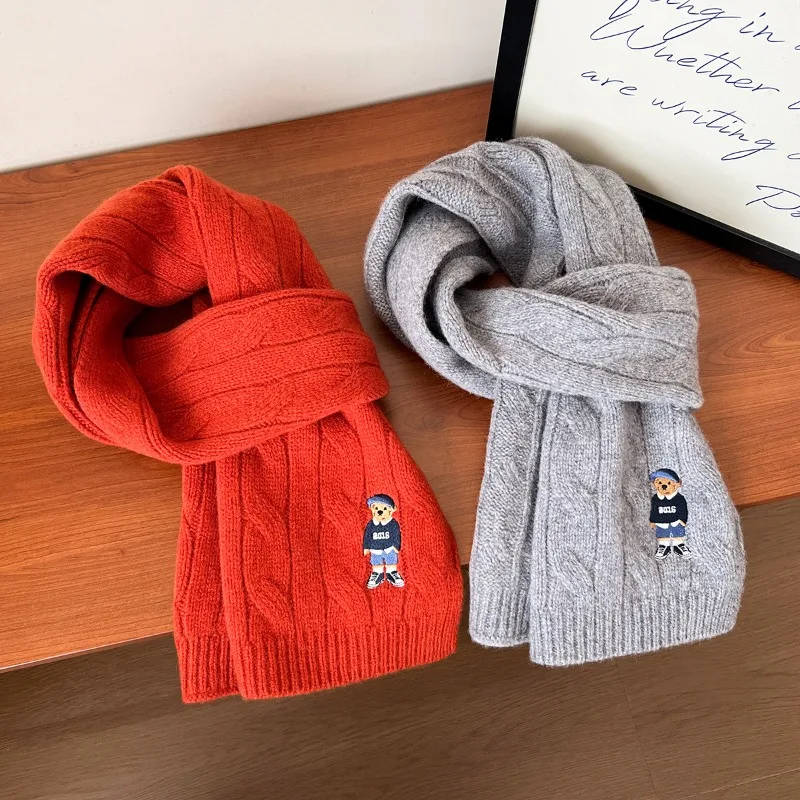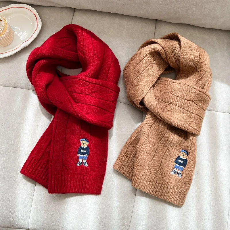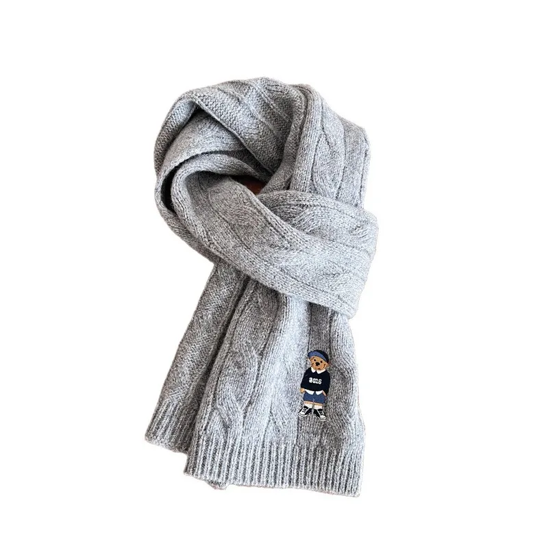 New 100% Australian Wool Scarf Twisted Cable Knit British Vintage Embroidered Knitted Bear Scarf Thickened for Warmth