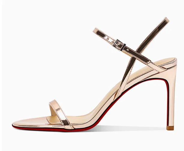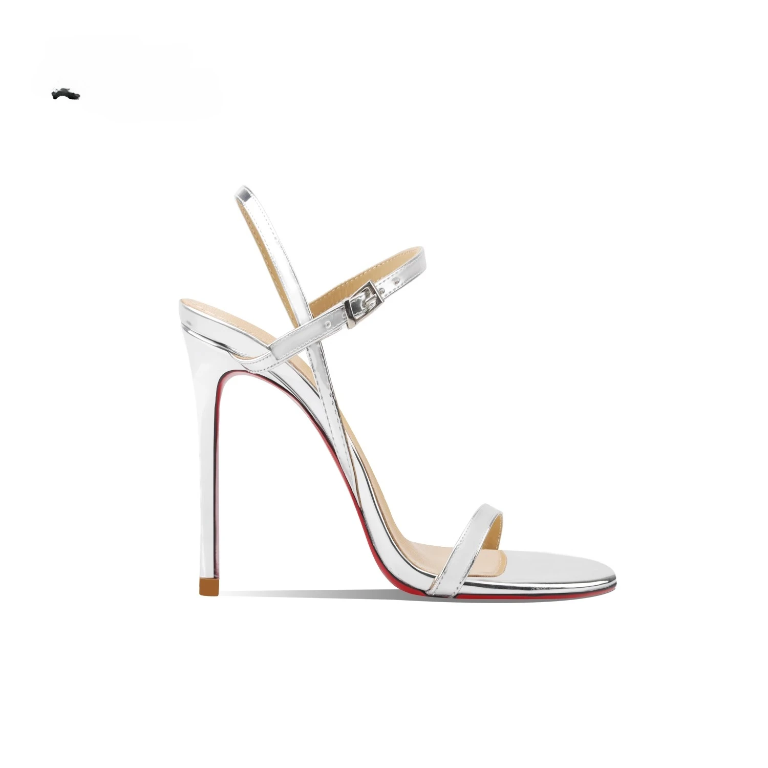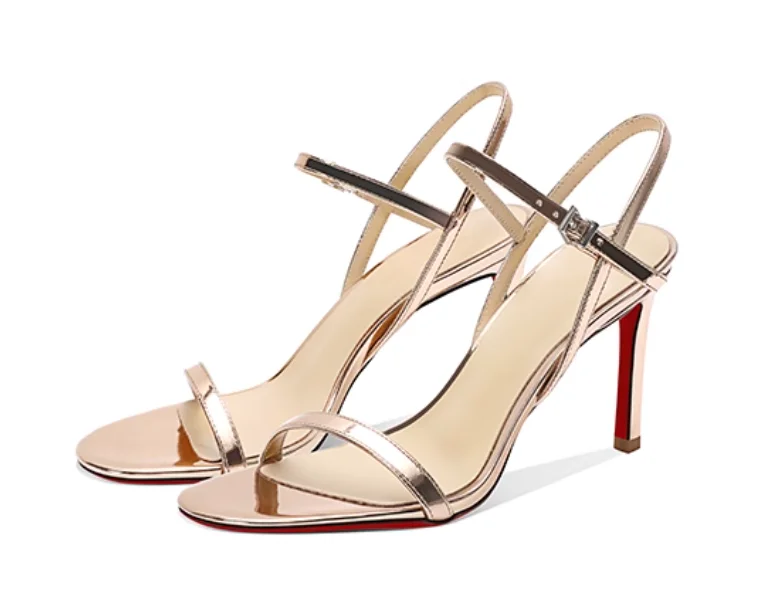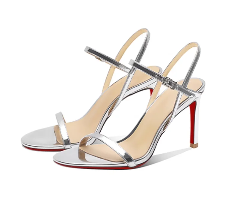 New silver patent leather temperament high-heeled sandals for women with exposed toes, slim heels, and comfortable single shoes
