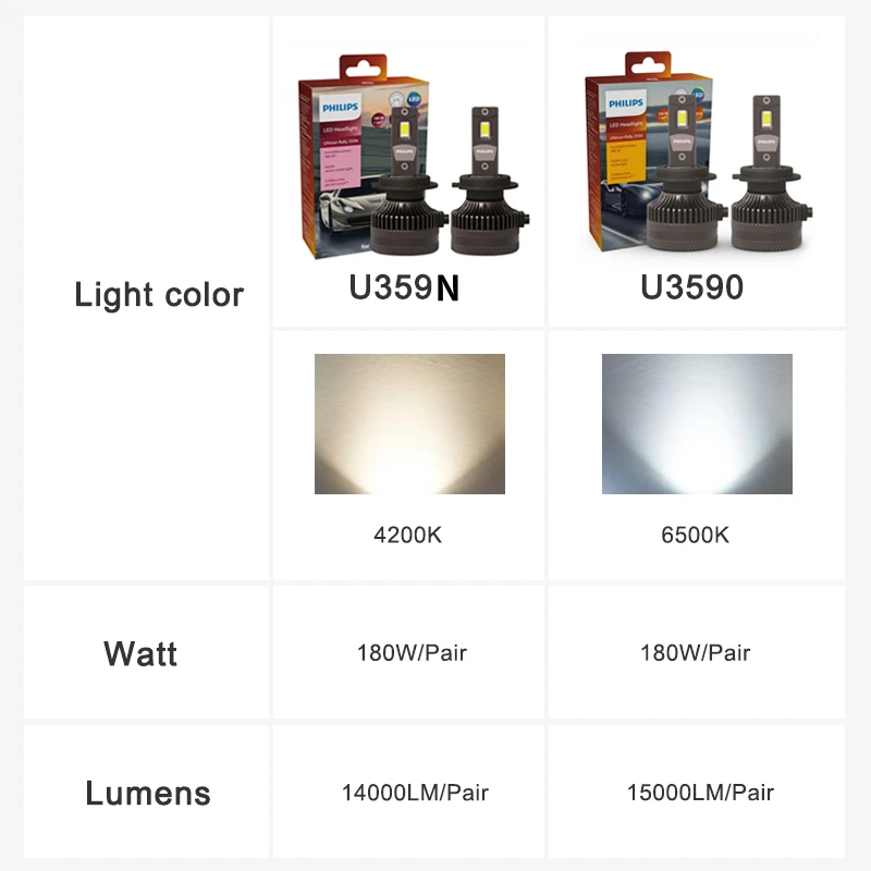 Philips Ultinon Rally 3590/359N LED H4 H7 H11 HB3 HB4 HIR2 180W Power Bright Car Headlight 6500K White Max/4200K xenon-white light Lumen Watt LED Bulbs