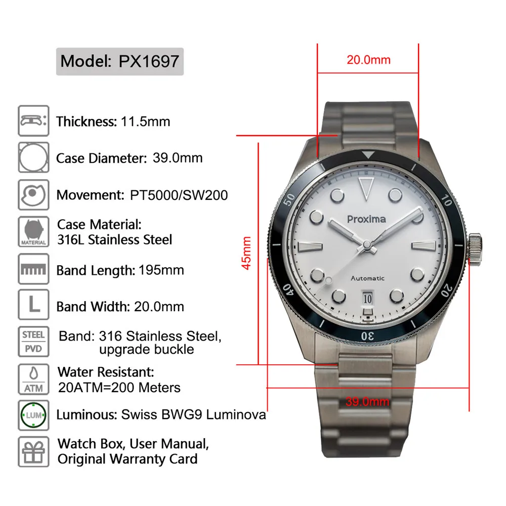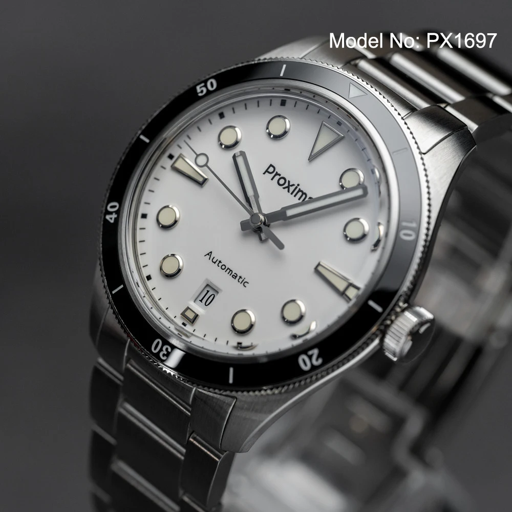 Proxima PX1697 39mm Men Watch White Enamel Dial Bubble Sapphire PT5000 SW200 Automatic Mechanical Vintage Watches 20Bar Luminous