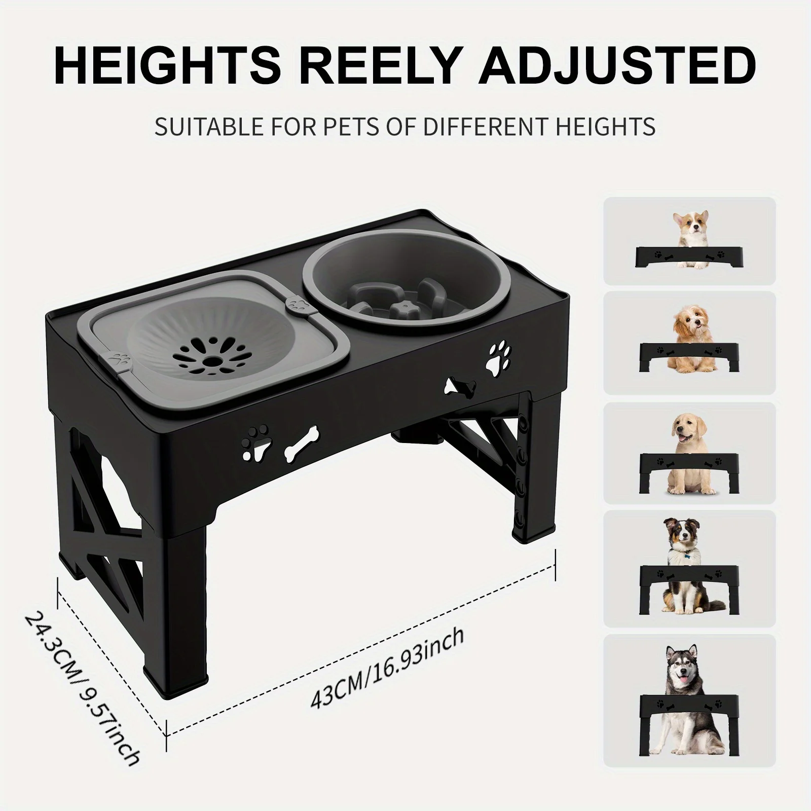 【Adjustable Height Dog Bowl】The heightened dog bowl is designed to make your pet's meals more comfortable. Take out the dog bowl and open the folding legs, push down to fix the feet, press the buckle to adjust different heights.Put on the bowl, add water and food to the bowl, and your pet can eat. This adjustable elevated dog bowl can be used by your puppy until adulthood