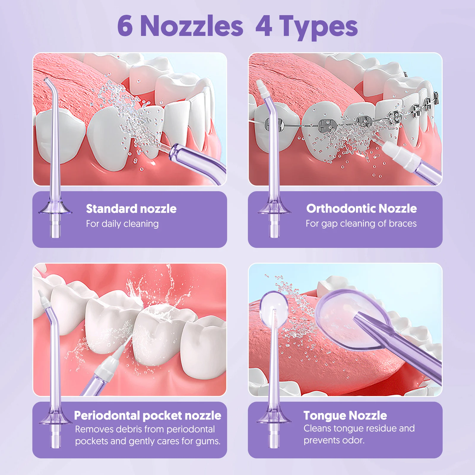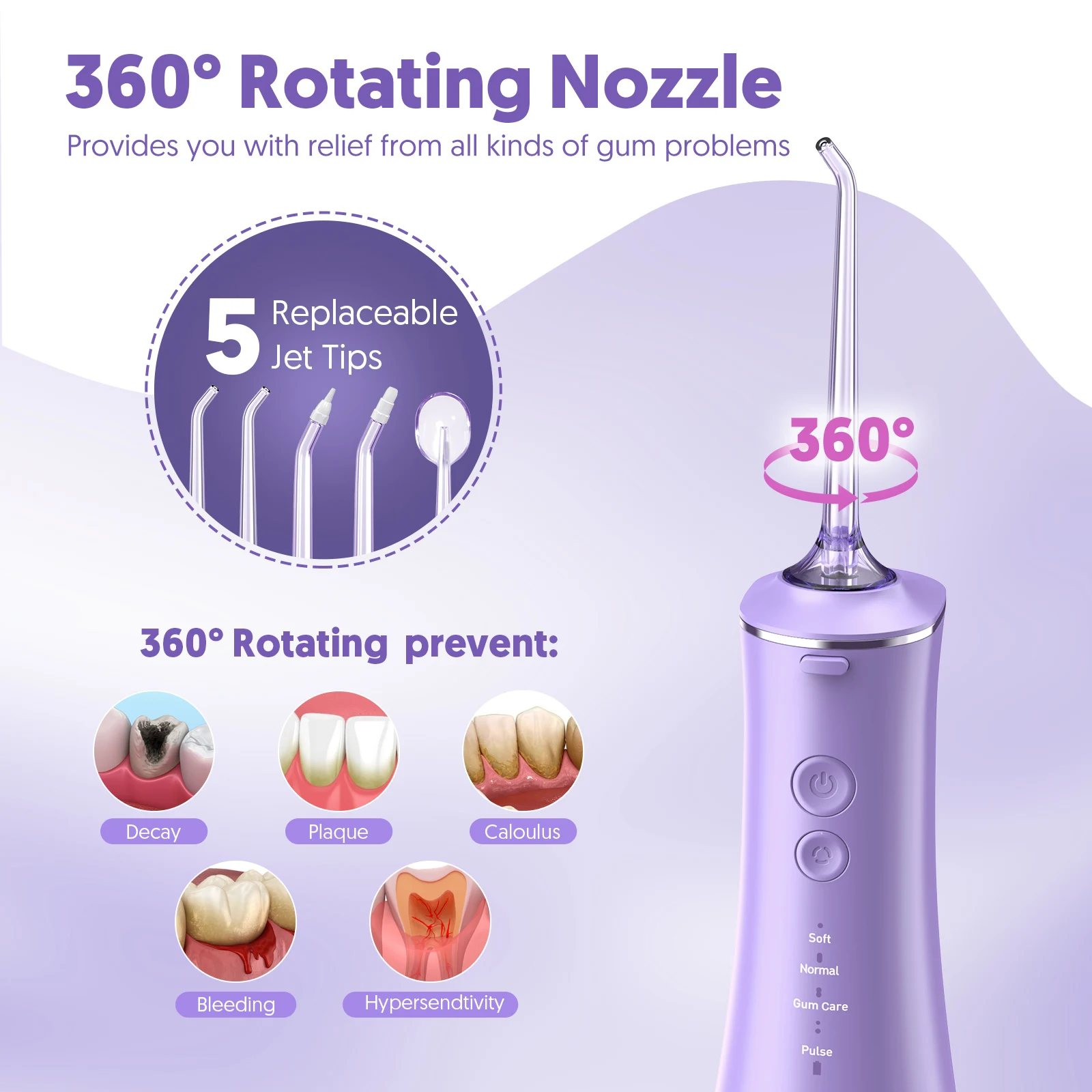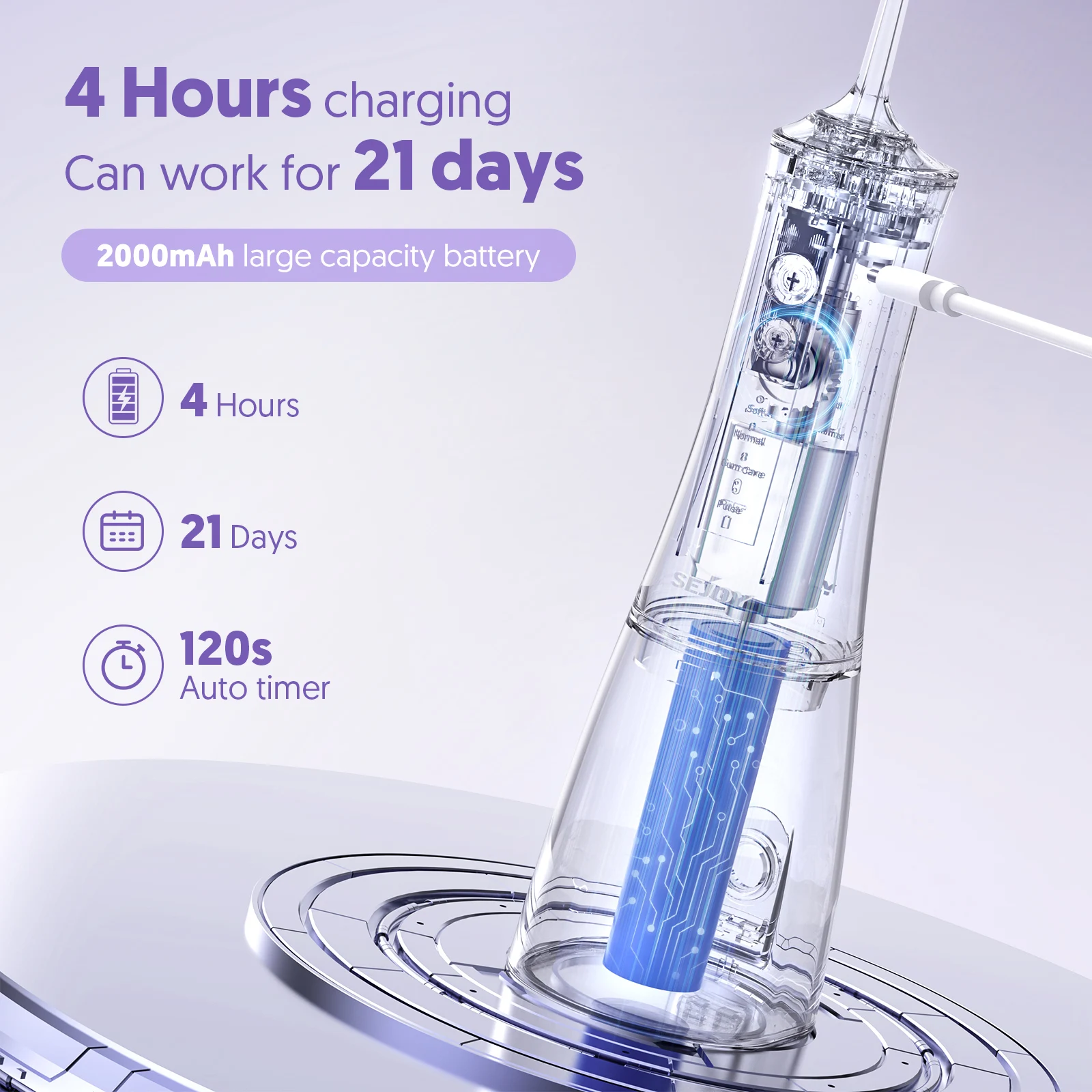 【 Super Long Battery Life & Waterproof】Water dental piks With powerful and environmental battery, fully charged need 4 hours and used continuously for about 30 days. With dual-sealing protection, Our water flosser cordless is leakproof and IPX6 waterproof,ensuring safe use for bathroom or shower. Come with USB cable,compatible with various charging devices. Perfect for travel and home use!
