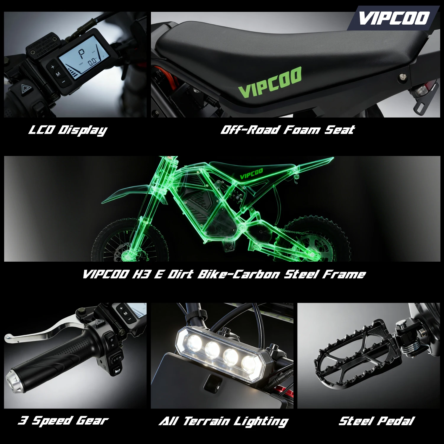 VIPCOO Electric Dirt Bike 3500W Motor 48V 23AH Battery 63KM/H Max Speed 40-70KM Range Hydraulic Brakes Off Road Electric Bike