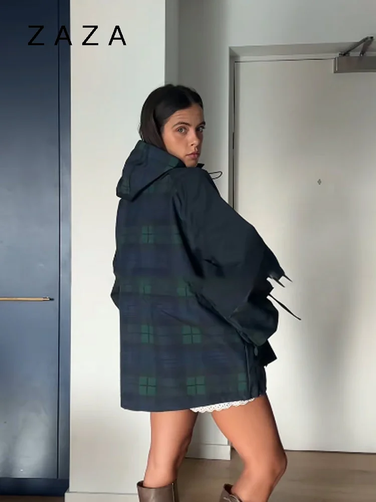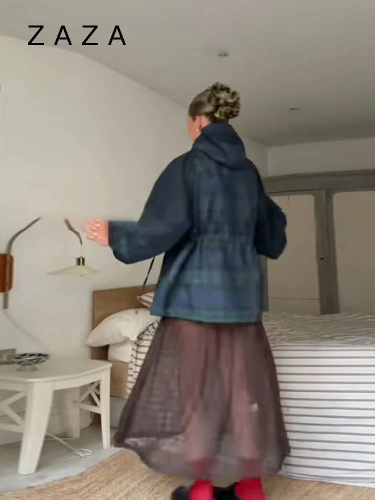 Women Vintage Grid Loose Jacket Oversize Loose Stand Collar Coat Long Sleeve Hoodie Lace Up Outwears 2025 New Lady Streetwears