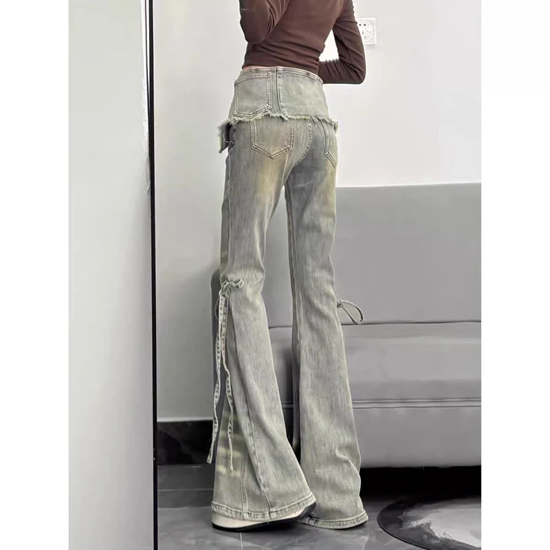 ZHIZOU Winter Women Goblin Core Low Waisted Flare Denim Pants Patchwork Japanese Abi Y2k Harajuku Bell-Bottom Skinny Jean Grunge